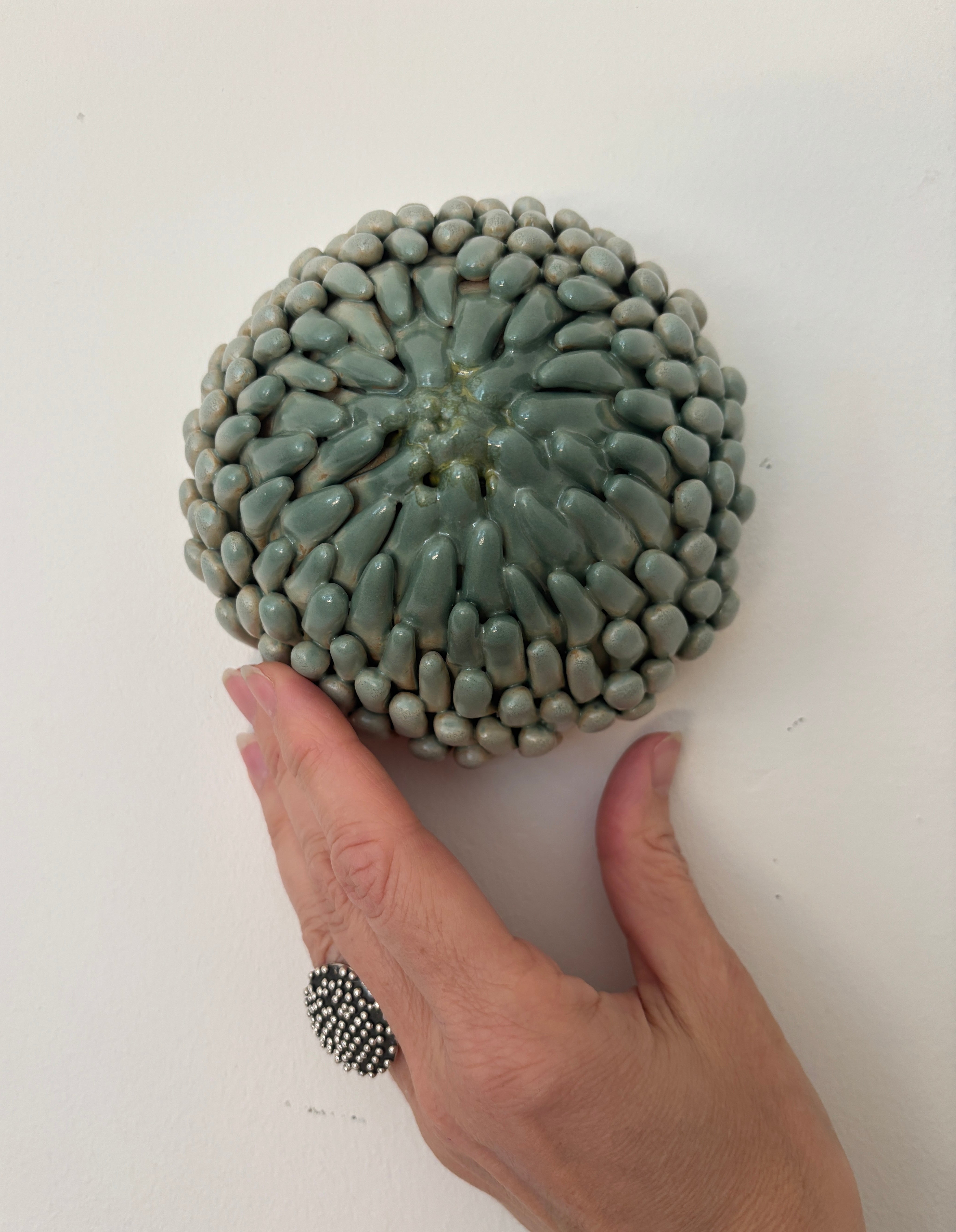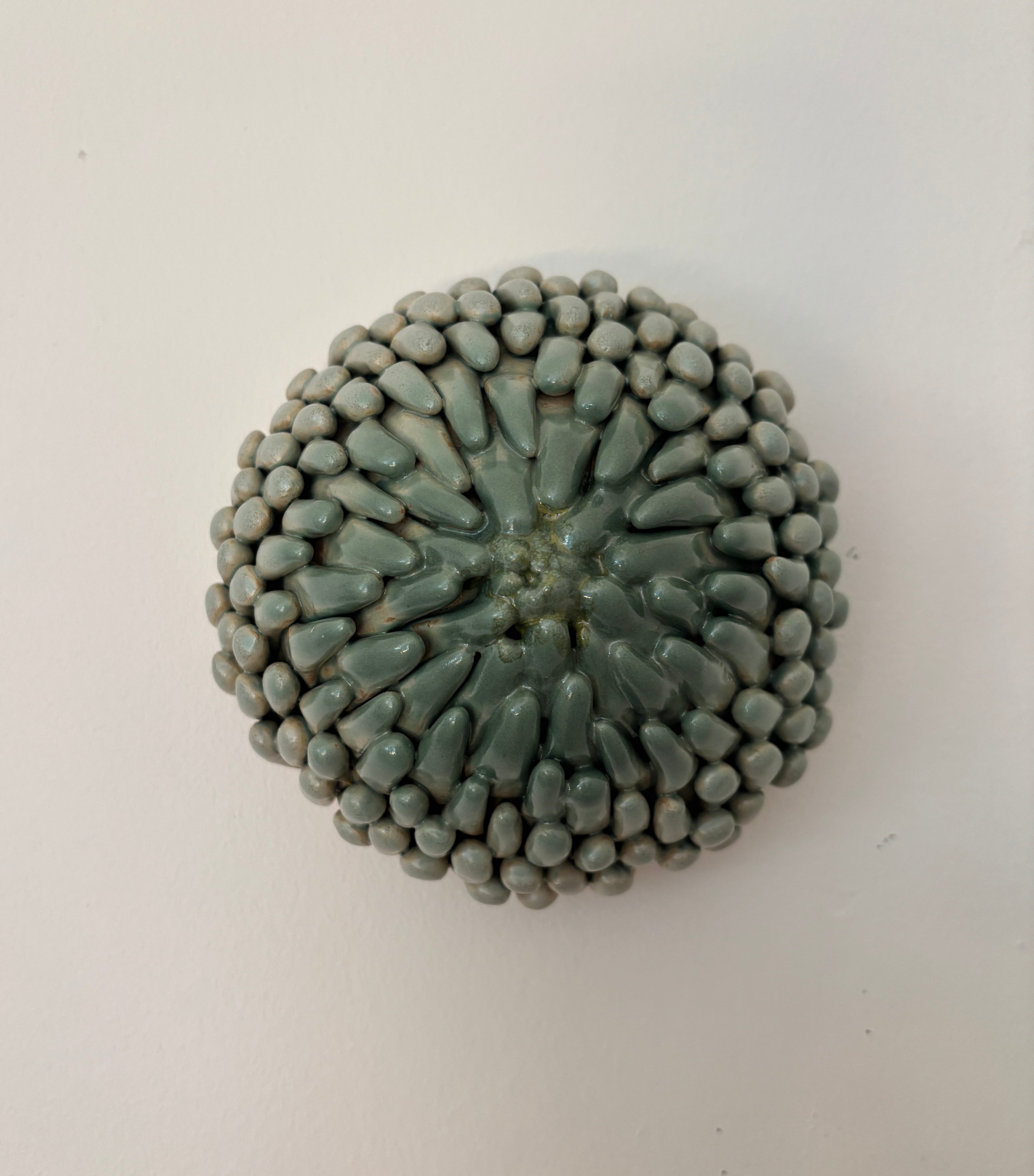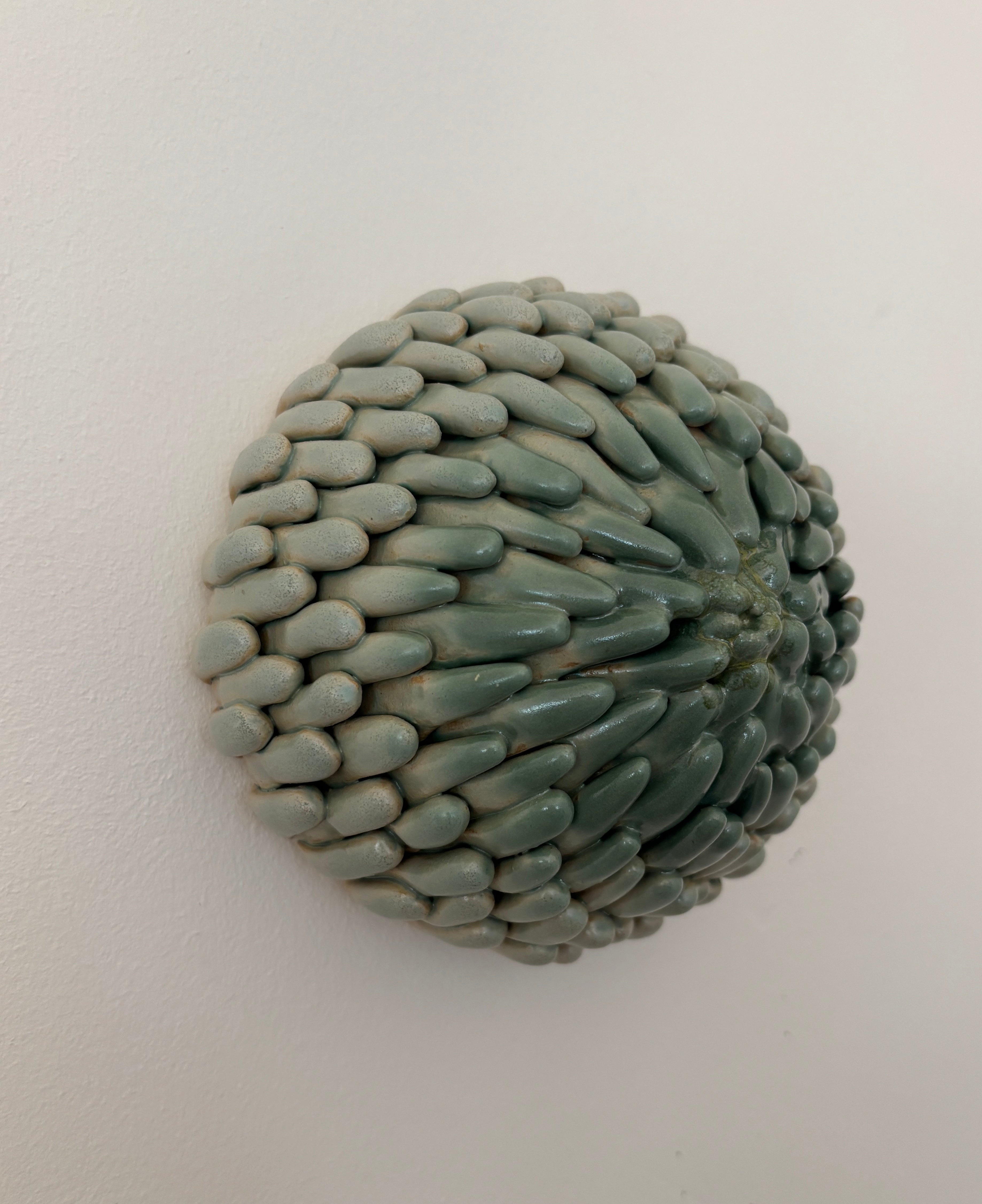 Through repetition and the accumulation of small, individually shaped elements, dense, tactile surfaces emerge with a sense of movement — like wind moving through something soft — even though the material is frozen in fired ceramic.